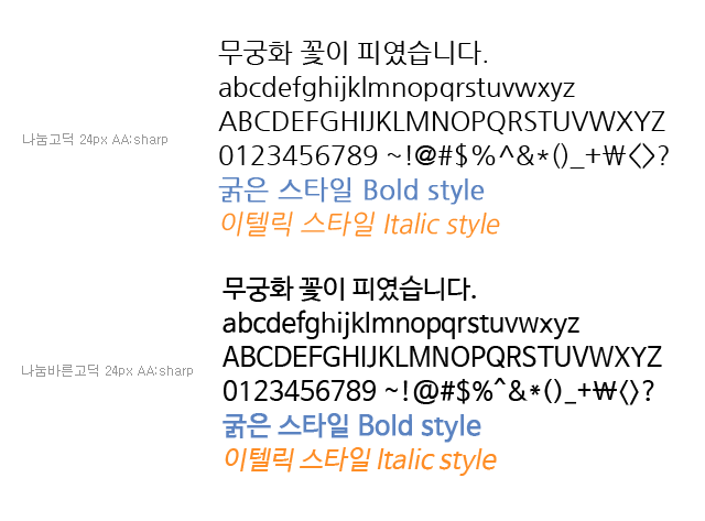 밑에 이미지는 각 글꼴체를 나타내는 것인데요 나눔바른글꼴고딕이 더욱 더 선명하고 또렷한 느낌을 줍니다.
