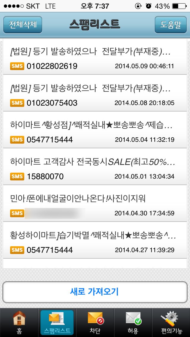 다행히 저는 스팸성과 스미싱 문자는 모두 스팸함에 들어가도록 설정을 해 두었습니다..