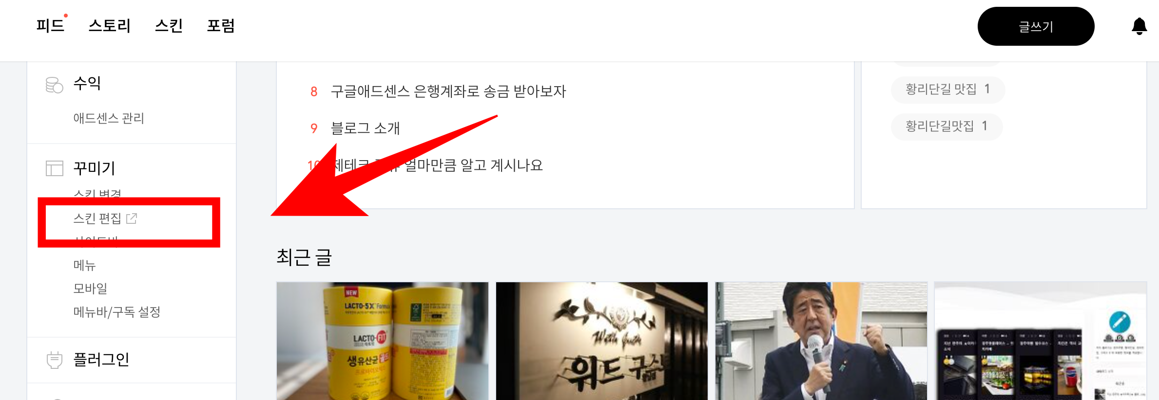 스킨편집에 들어가시면 왼쪽에는 본인의 블로그가 보이고 오른쪽에슨 설정란이 보입니다.