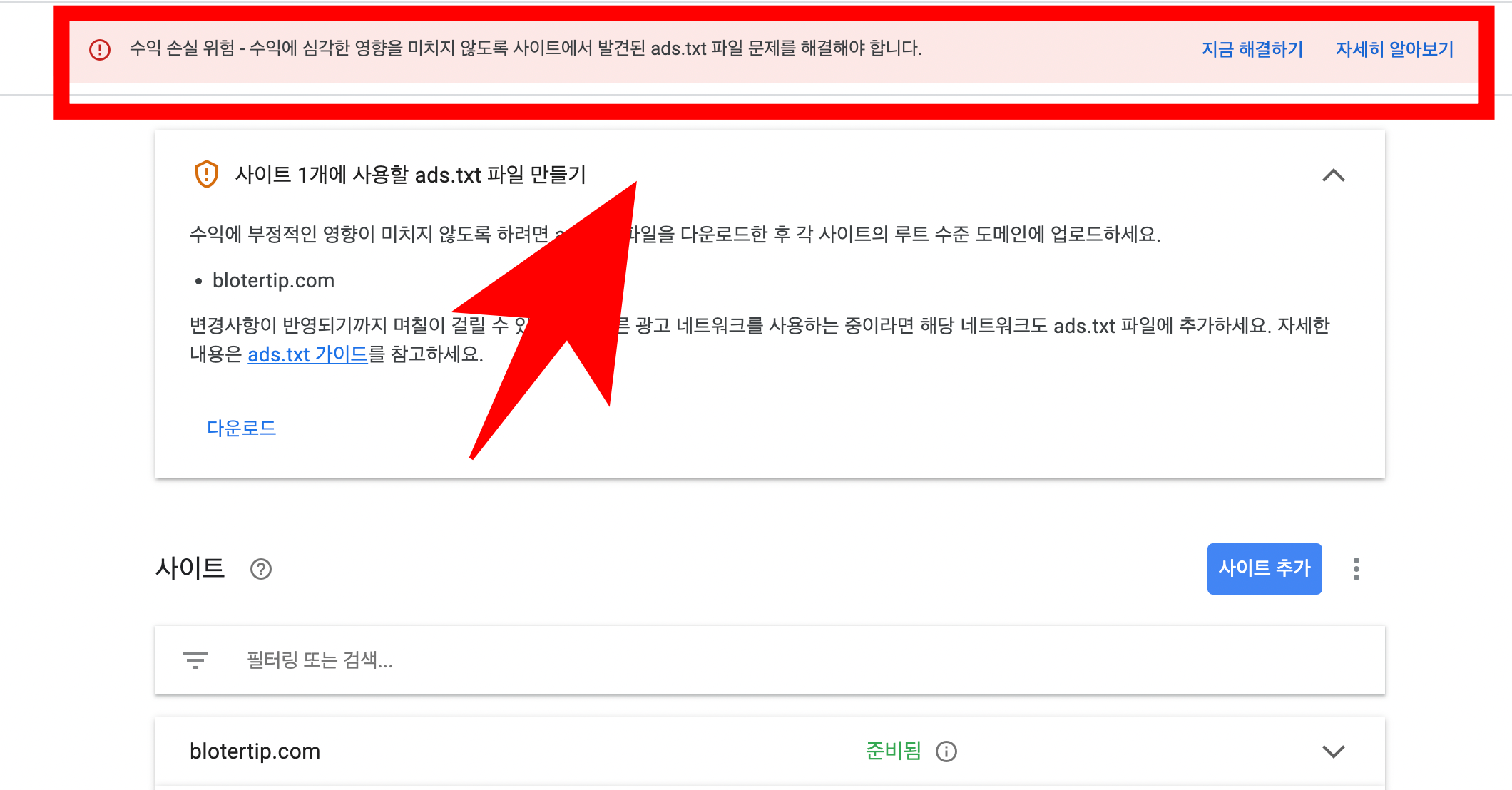클릭을 하시면 오른쪽 상단에 수익 손실 위험 – 수익에 심각한 영향을 미치지 않도록 사이트에서 발견된 ads.txt 파일 문제를 해결해야 합니다. 라는 문구가 보입니다.