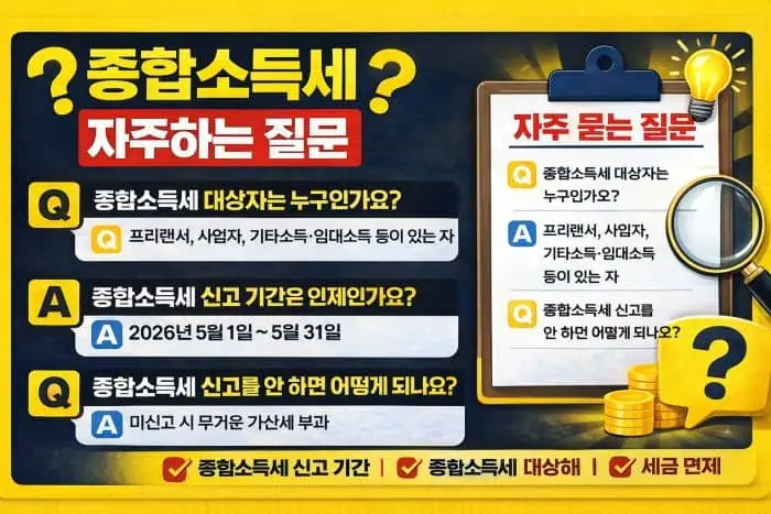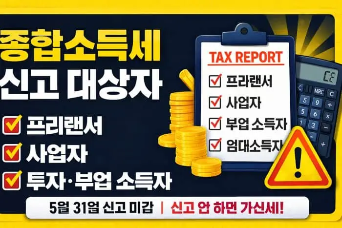 2026년이 되면서 많은 분들이 가장 궁금해하는 것 중 하나가 바로 종합소득세 신고입니다. 특히 프리랜서, 자영업자, 부업을 하는 직장인이라면 반드시 알아야 할 중요한 세금인데요. 신고 기간을 놓치거나 대상 여부를 잘못 판단하면 가산세까지 부담할 수 있기 때문에 정확한 정보 확인이 필수입니다.