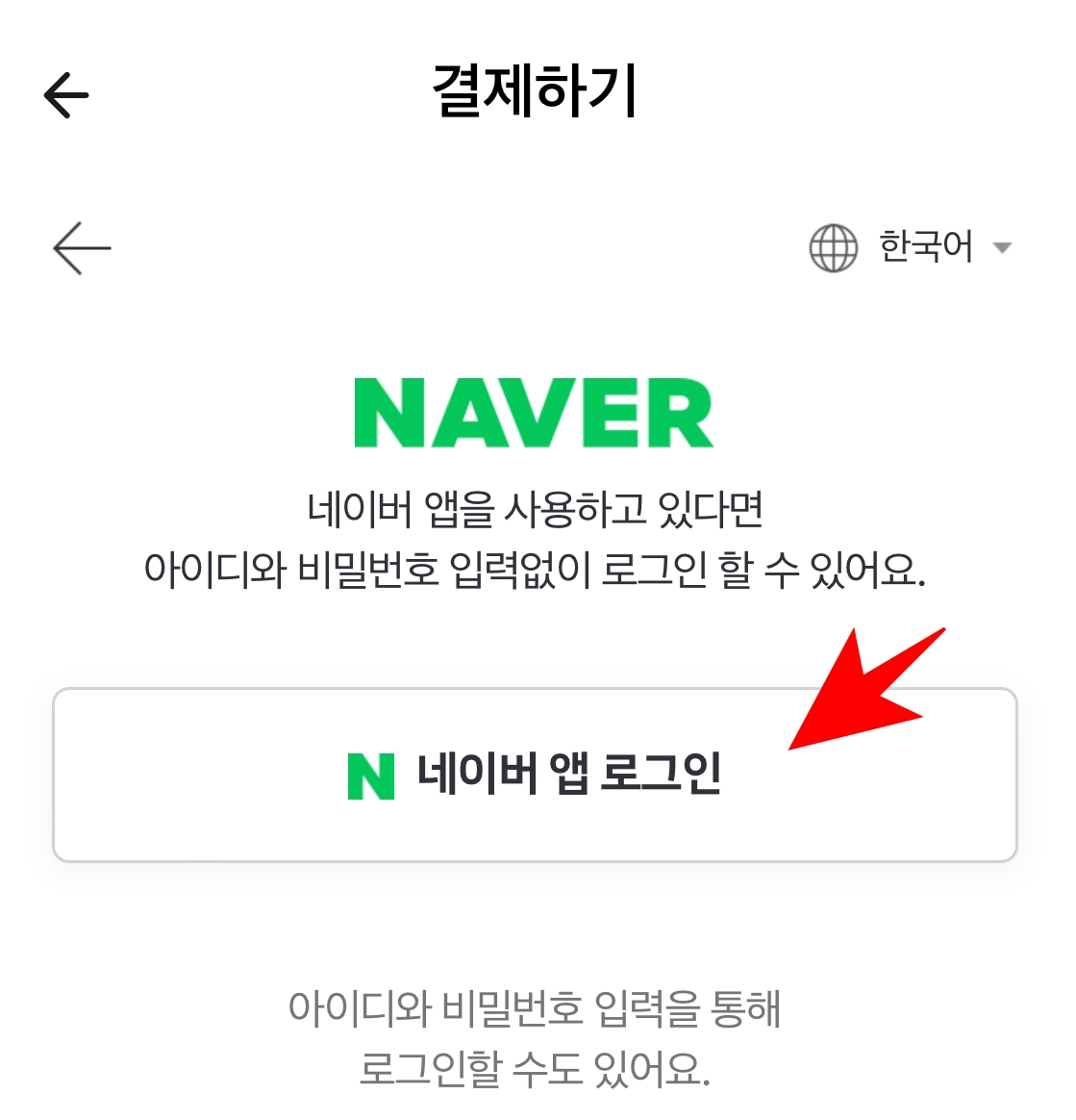 네이버 아이디를 클릭하시면 네이버페이를 설정하셨을 때 패스워드를 넣으시고 마지막으로 결제하시면 끝입니다.