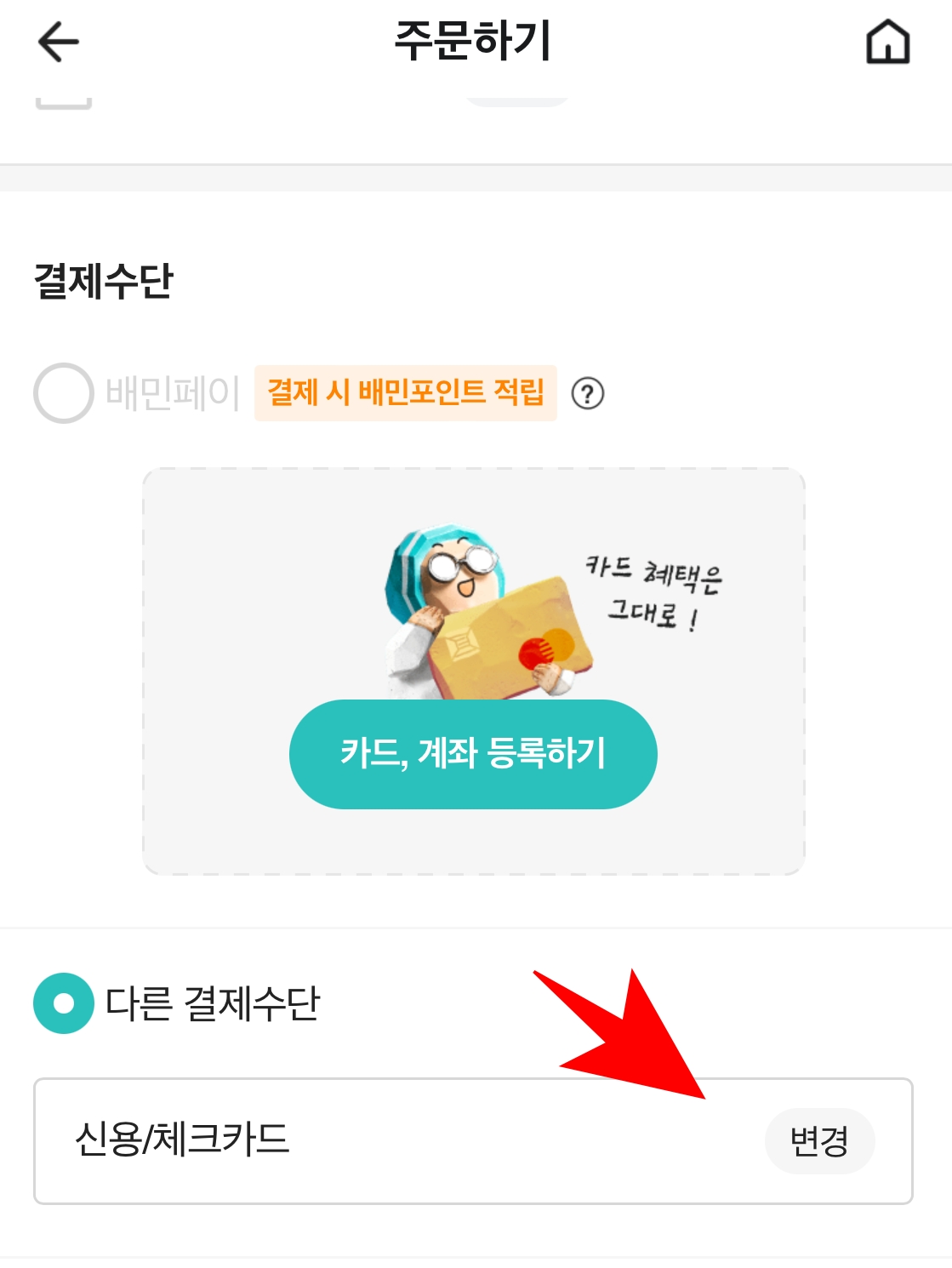 결제하기를 누르시면 어떻게 결제할는지가 나오는데요 밑에 신용/체크카드 변경을 클릭해 주세요...