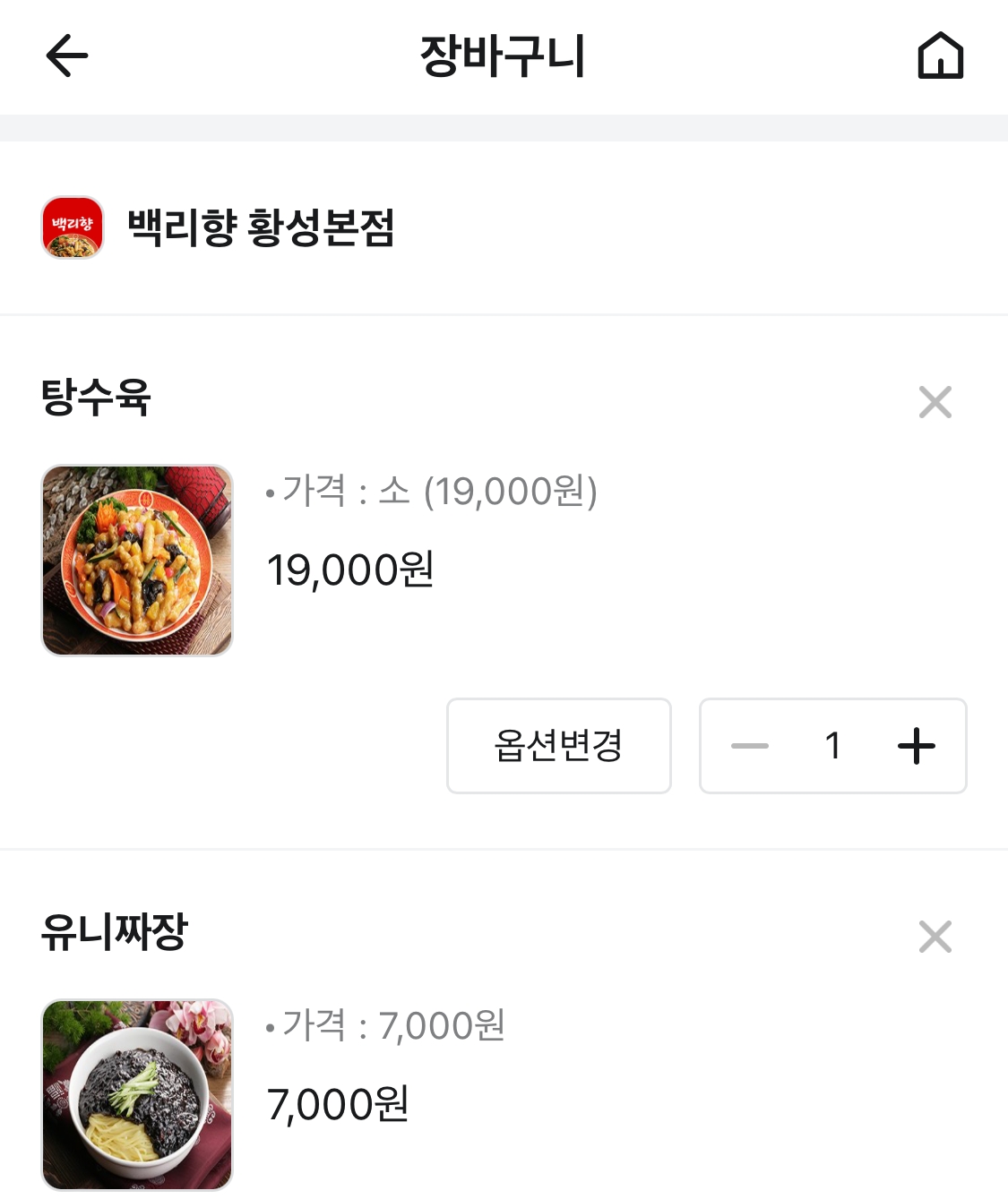 그리고 나서 본인이 좋아하시는 음식을 찾으셔서 장바구니에 넣습니다. 저는 황성동 백리향에서 유니짜장면과 탕수육을 하나 시켰습니다.