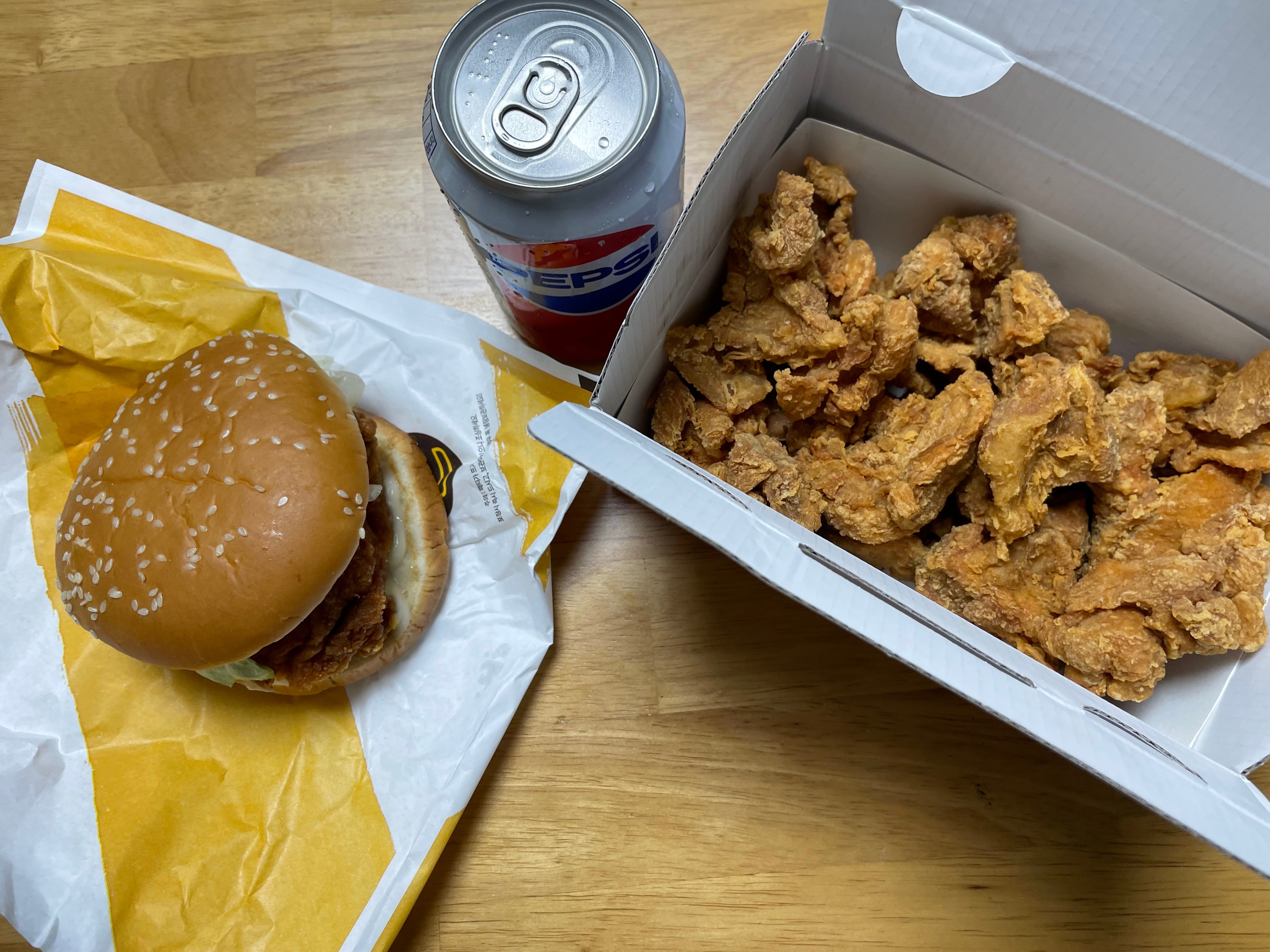 프라이드치킨 반 치킨입니다. 얼핏 보면 크리스피 치킨과 똑같아요... 시장에서 파는 프라이드치킨이라고 생각을 하시면 될 것 같아요...저는 치킨도 엄청나게 좋아합니다. 샤이버거를 먹고 간단하게 먹기에는 맞는 것 같아요... 치킨은 역시 치킨 전문점에서 시켜 먹는 것이 나을 듯... ㅎㅎ 콜라는 꼭 드세요.. 소화제 역할을 합니다..^^