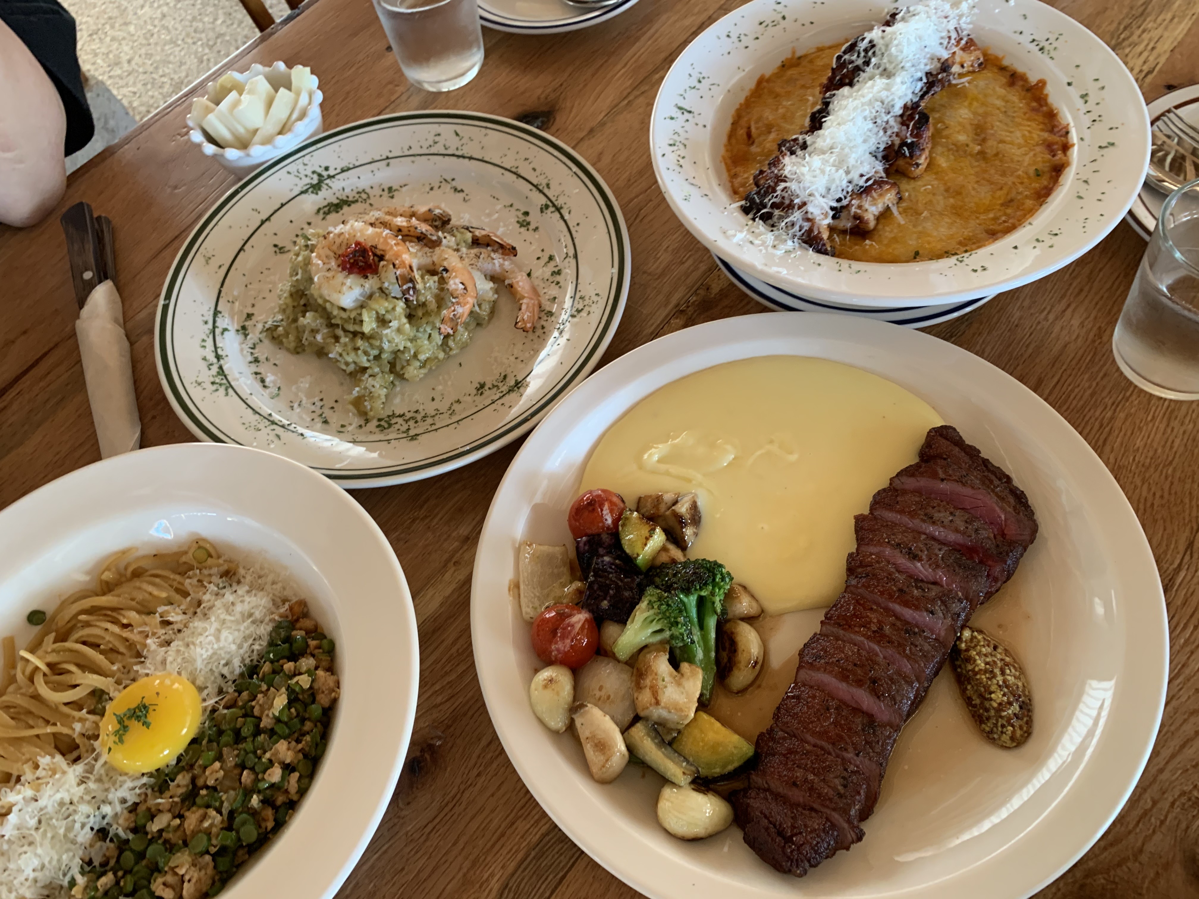 음식은 모두 4개로 시켰습니다.먼저 조밀스테이크, 토마토 치킨 오븐파스타, 새우바질리조토, 마늘푸레파스타 입니다.