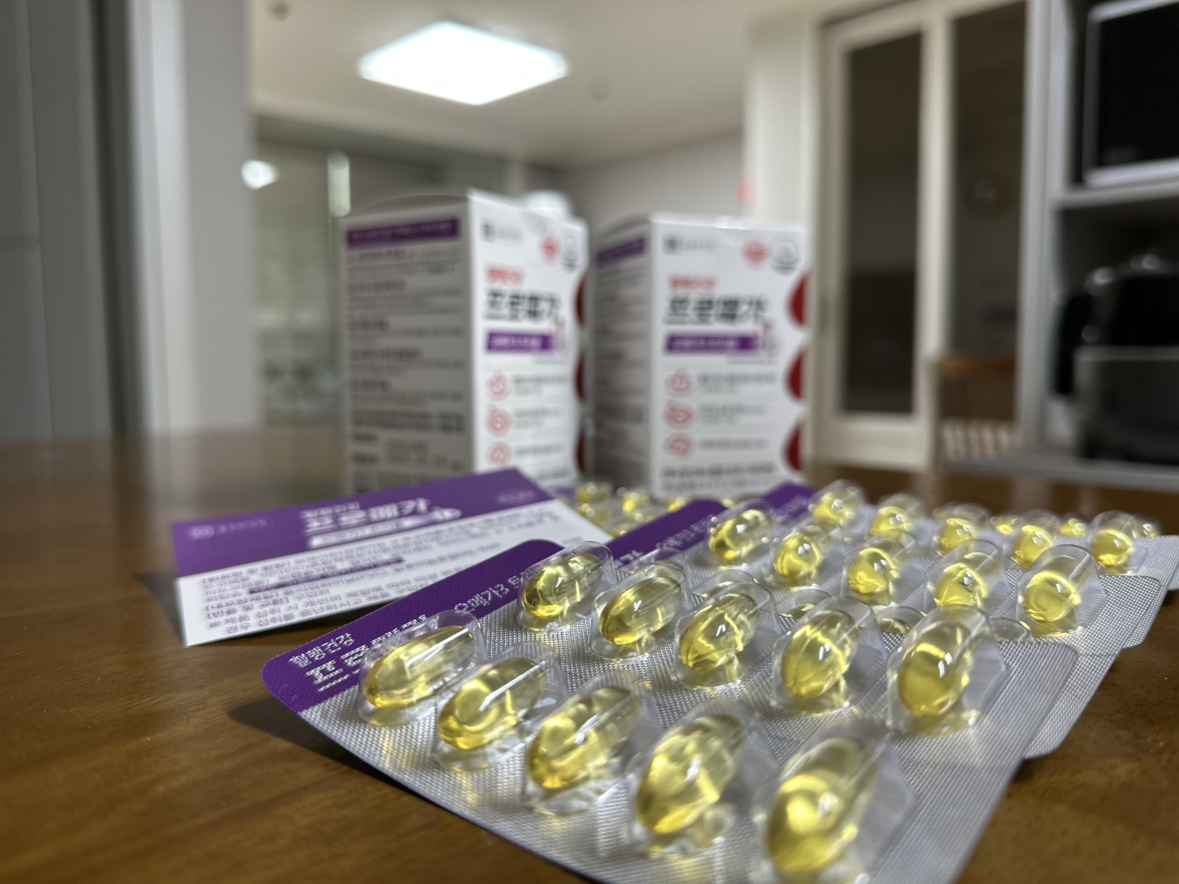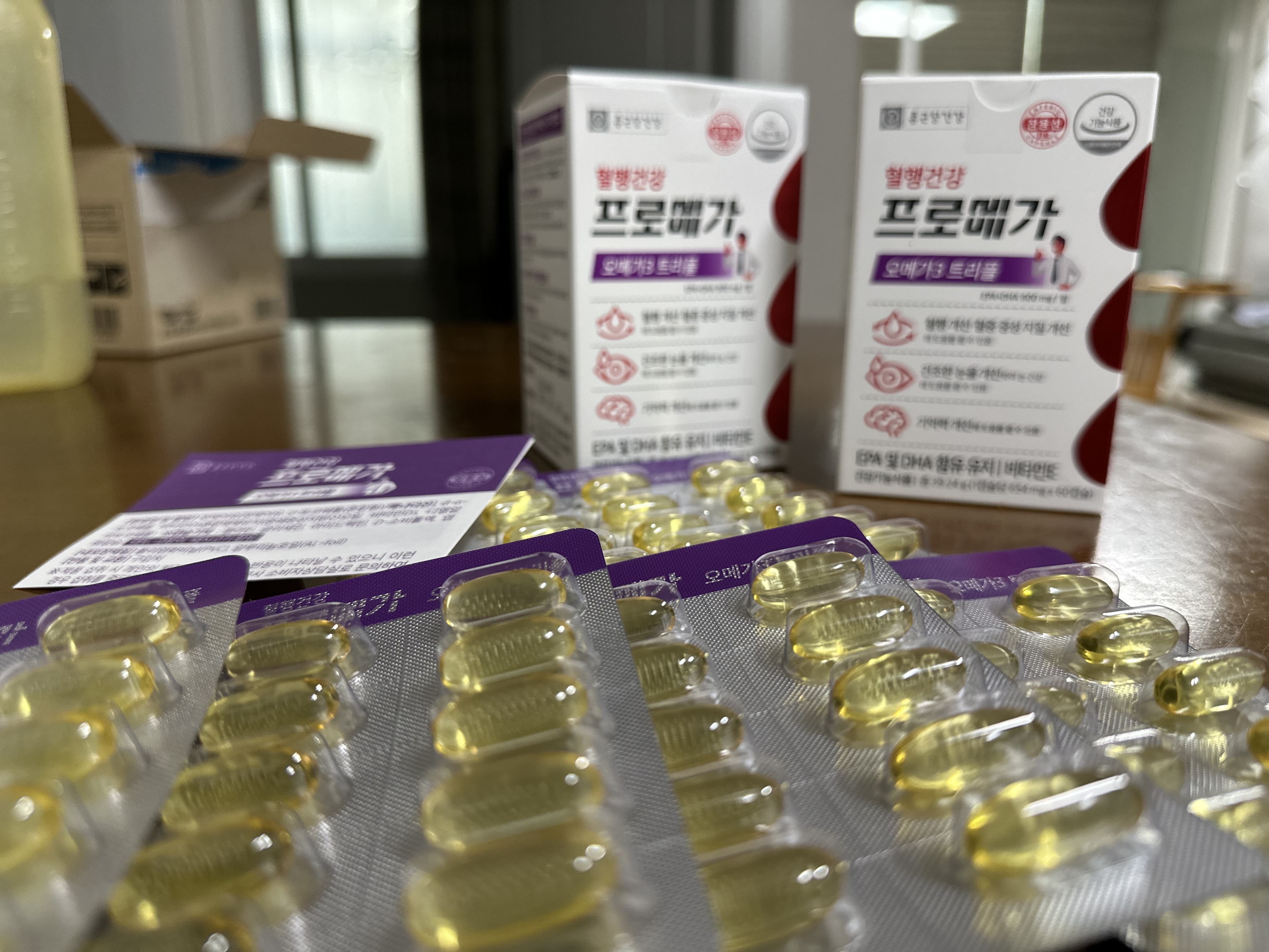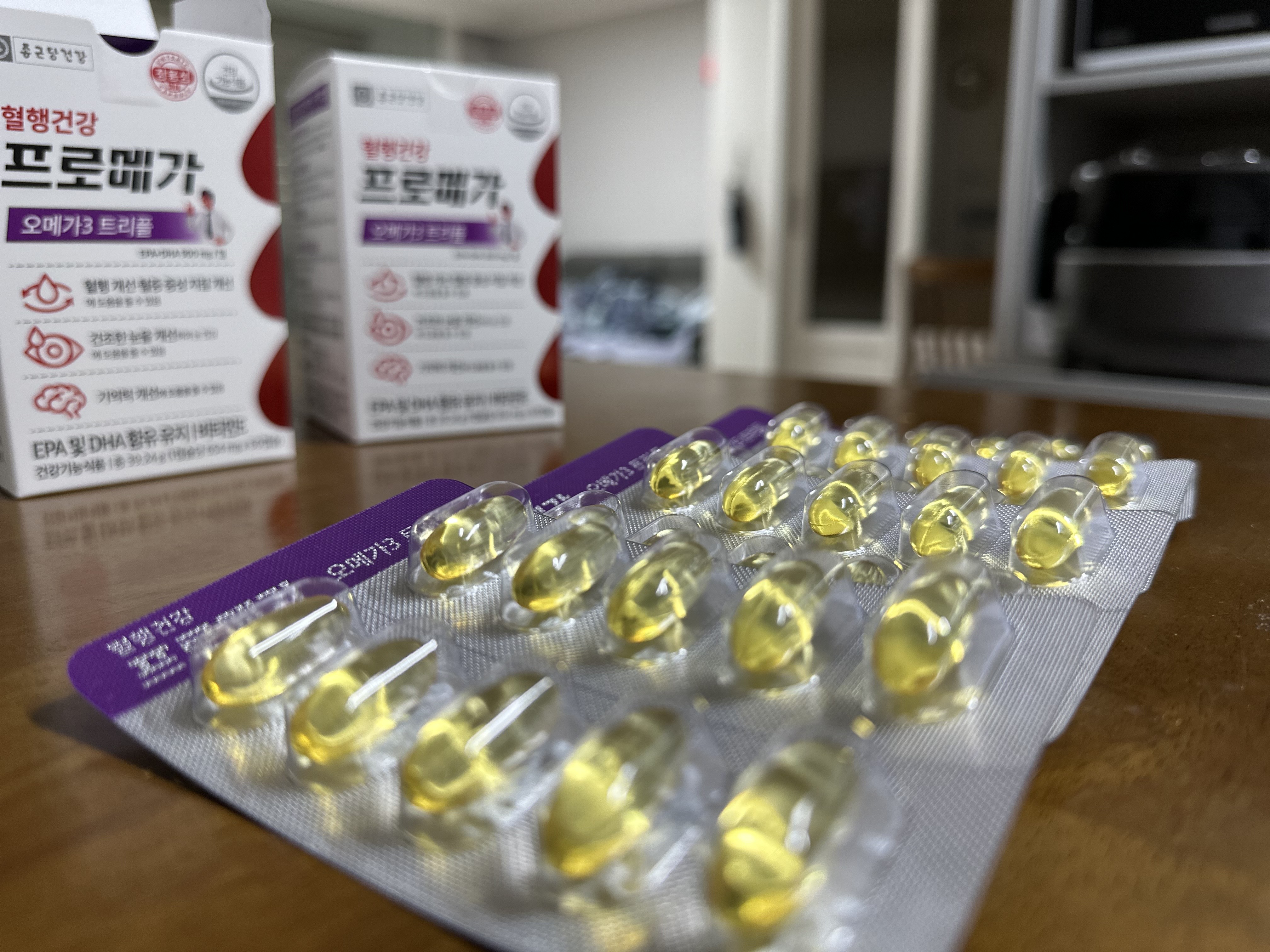 불혹의 나이를 지나니 몸이 신호를 보내는 것 같습니다.. 그래서 먹고 있는 보조 식품이 센트룸과 아이클리어 이었는데 이번에 종근당 프로메가 오메가3 트리플 입니다..