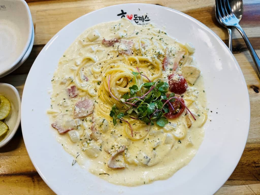 둘이라서 우선 파스타 하나씩 시키고 대표적인 메뉴 효돈까스 하나를 시켰습니다.