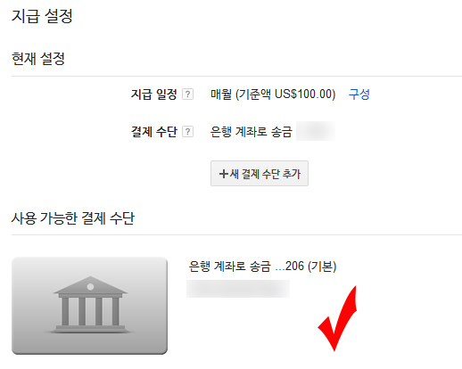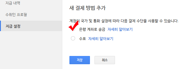 구글애드센스 로그인 => 지급설정 => 결제수단