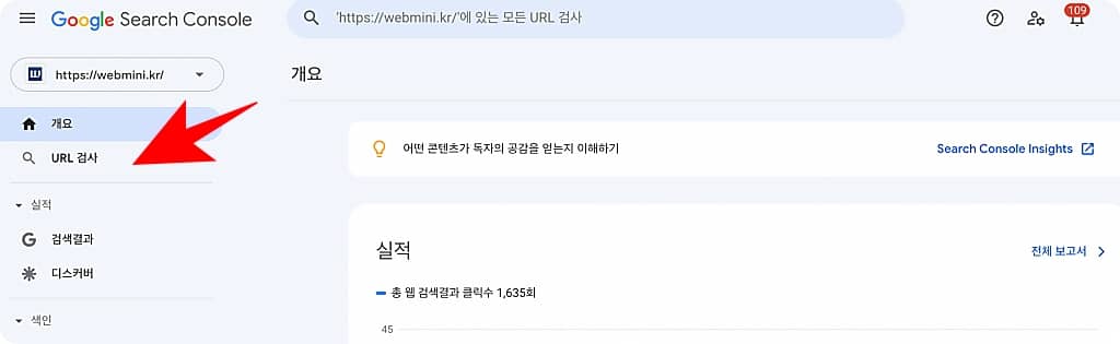그러면 왼쪽 상단에 도메인 주소와 밑에 개요 그리고 URL 검사가 있습니다.