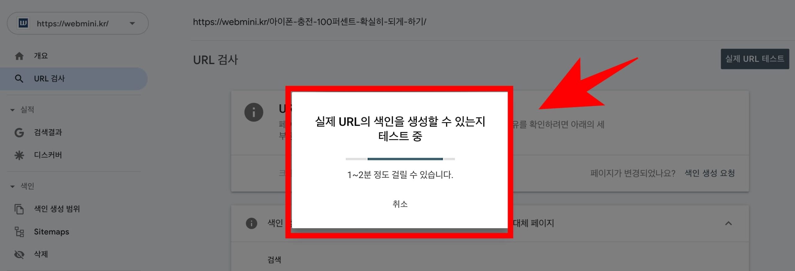 실제 URL의 색인을 생성할 수 있는지 테스트 중 이라고 뜨면서 체크를 하게 되고