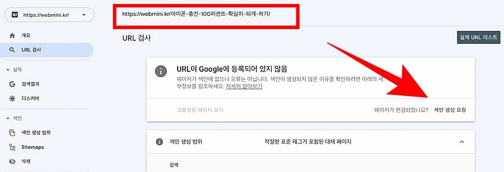 구글에서실제 URL의 색인을 생성할 수 있는지 테스트 중이라 뜨면서