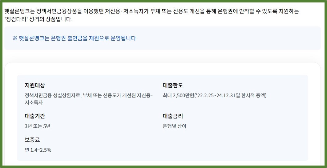 햇살론뱅크는 정책서민금융상품을 이용했던 신용등급이 낮으며 경제적으로 여러운 가정을 위해 부채 또는 신용도 개선을 통해 은행권에 안착할 수 있도록 지원하는 '징검다리' 성격의 상품입니다.