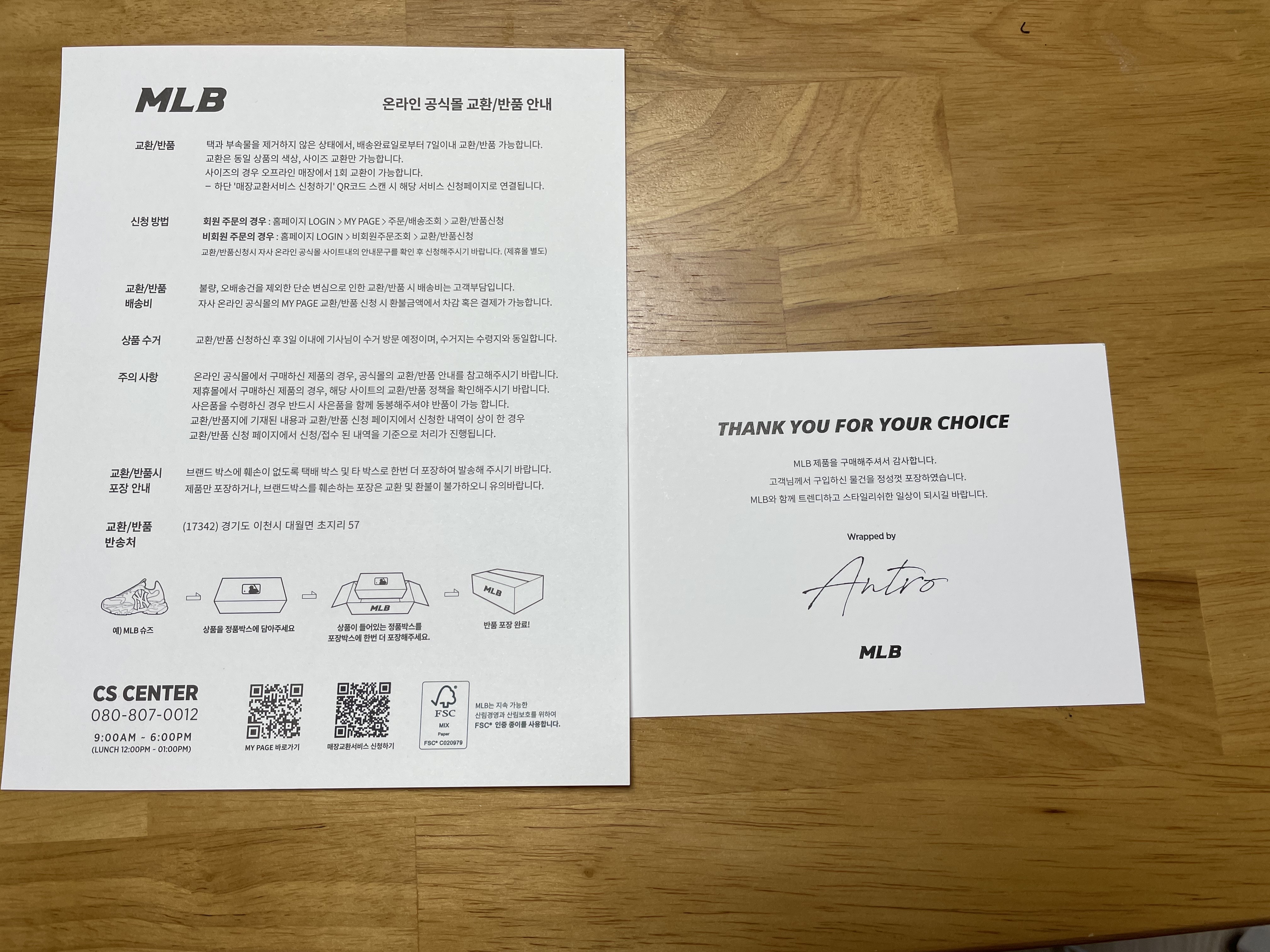밑에 교환/반품 안내서와 MLB 모자 루키 언스트럭쳐 볼랩 을 구입해 주셨다고 감사의 글도 써여져 있어요..